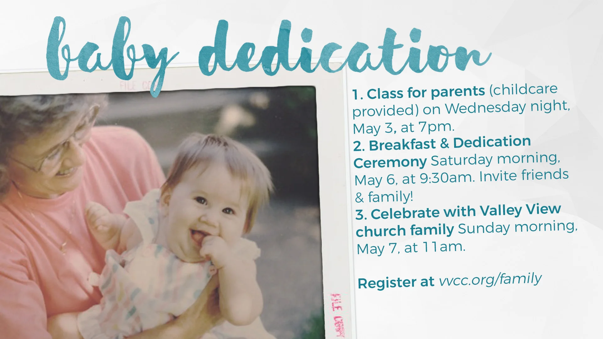 Baby Dedication Class Wednesday, May 3, 2017 7:00 PM 8:00 PM 19:00 20:00 Google Calendar ICS A Wednesday night class to educate and equip parents on what it looks like to raise children to be Jesus followers.