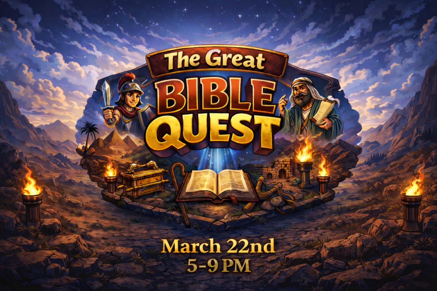 Excite night this Spring will be The Great Bible Quest! It will be an interactive adventure night for 6th–12th grade studentswhere teams will journey through Bible-themed challenges, puzzles, and quests as they work together to uncover clues and complete the mission. Along the way students will decode ancient scrolls, search for hidden artifacts, and use teamwork to unlock the next stage of the quest.