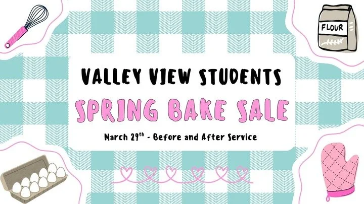 Join us for our Valley View Students Spring Bake Sale on March 29th, before and after service — this will be our final bake sale fundraiser as our students prepare for camp this summer!